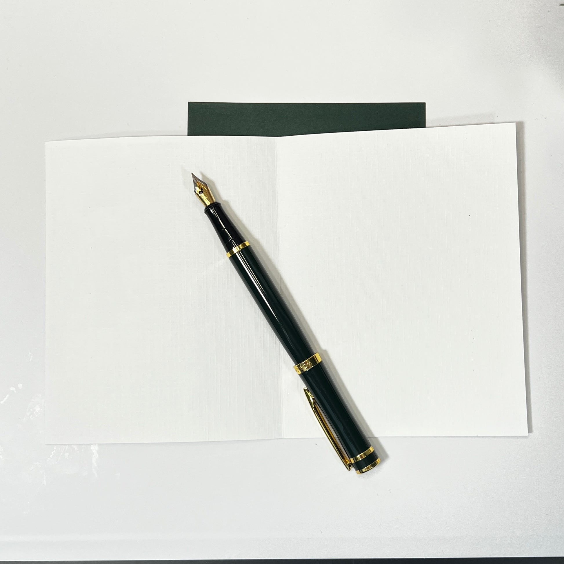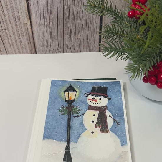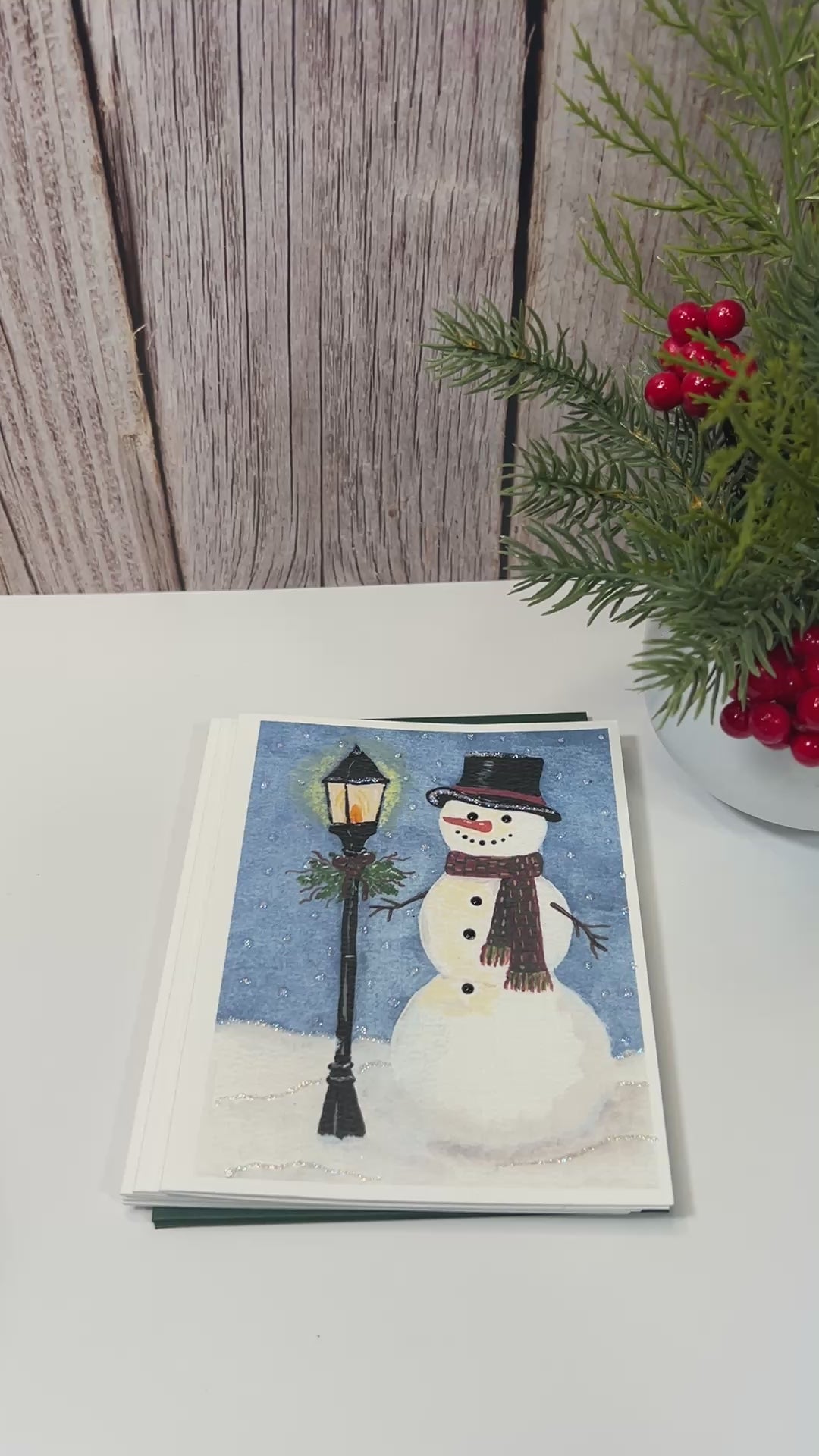 A peaceful 5-card A2 Christmas set featuring a hand-embellished snowman illustration and deep green envelopes. Blank inside for heartfelt notes.