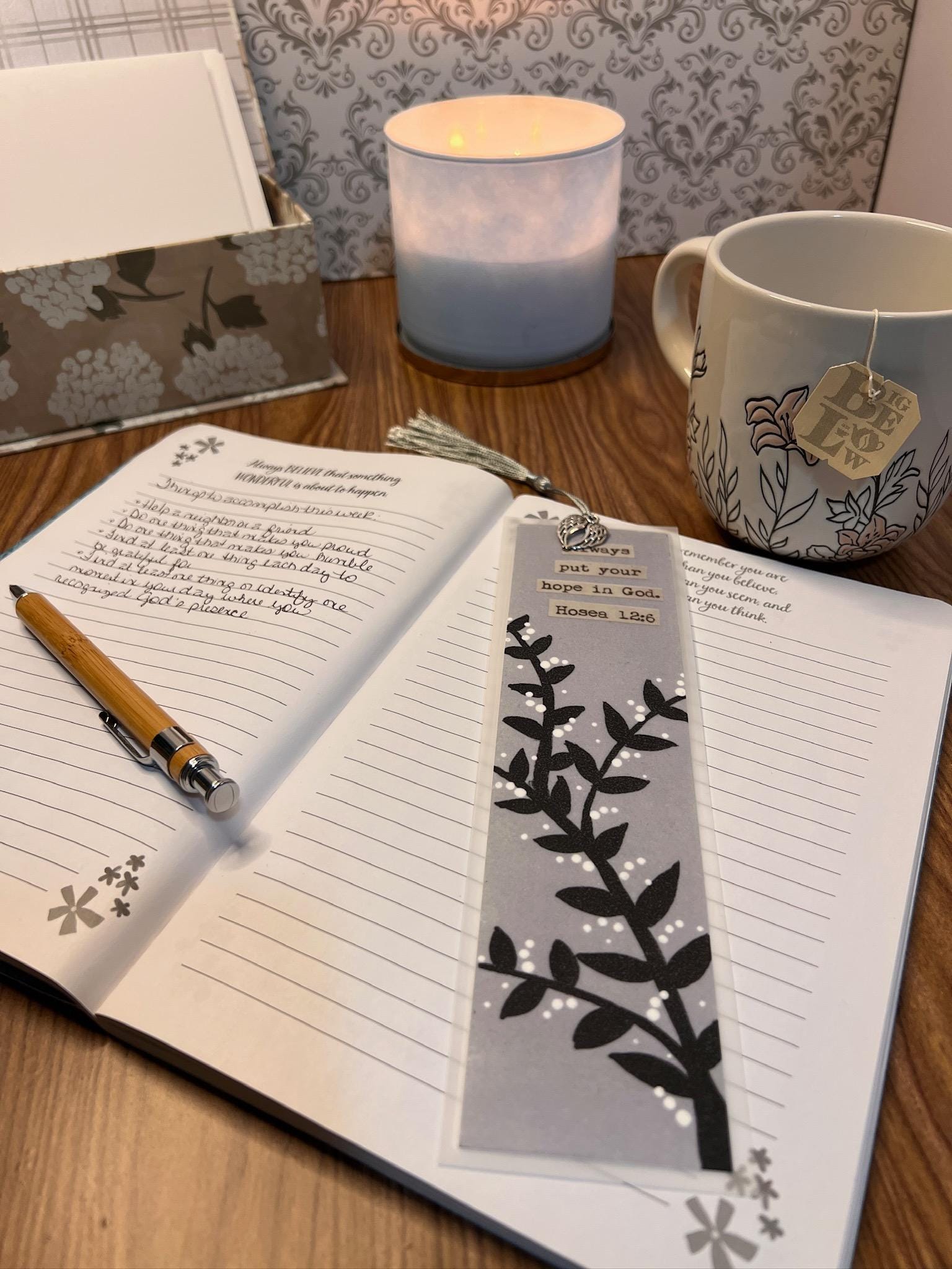Rooted in faith and designed with purpose, this Hope Bookmark is a beautiful reminder to keep your trust in God. Featuring the comforting words from Hosea 12:6 – “Always put your hope in God.” – this hand-painted bookmark showcases a graceful black branch with delicate white berries on a soft gray background.