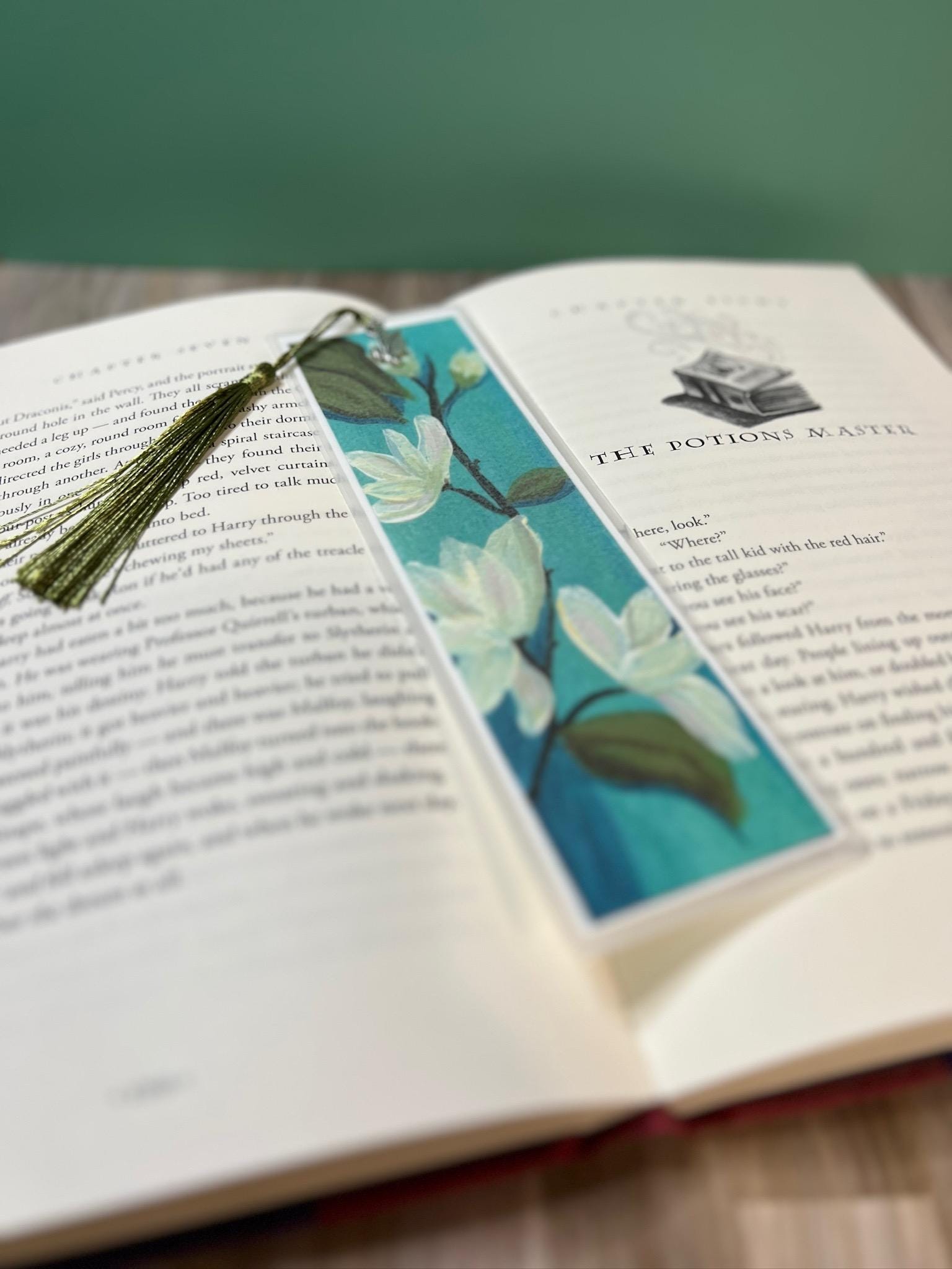 Grace your pages with the beauty of blooming magnolias. The Magnolia Dreams Bookmark features a hand-painted white magnolia branch against a dreamy teal background, finished with a soft coordinated tassel and a delicate silver charm.